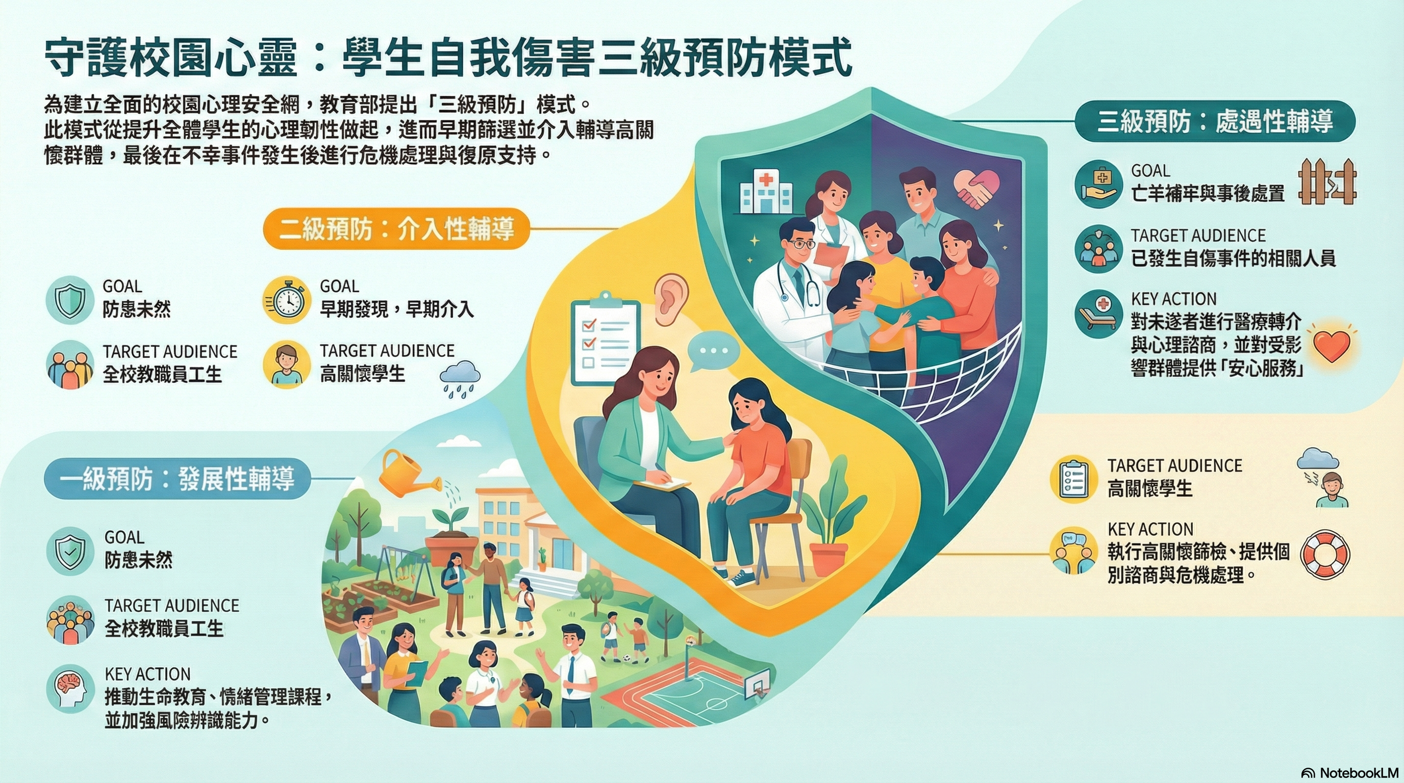 在此簡單介紹「自我傷害三級預防」的主要內涵,包括: