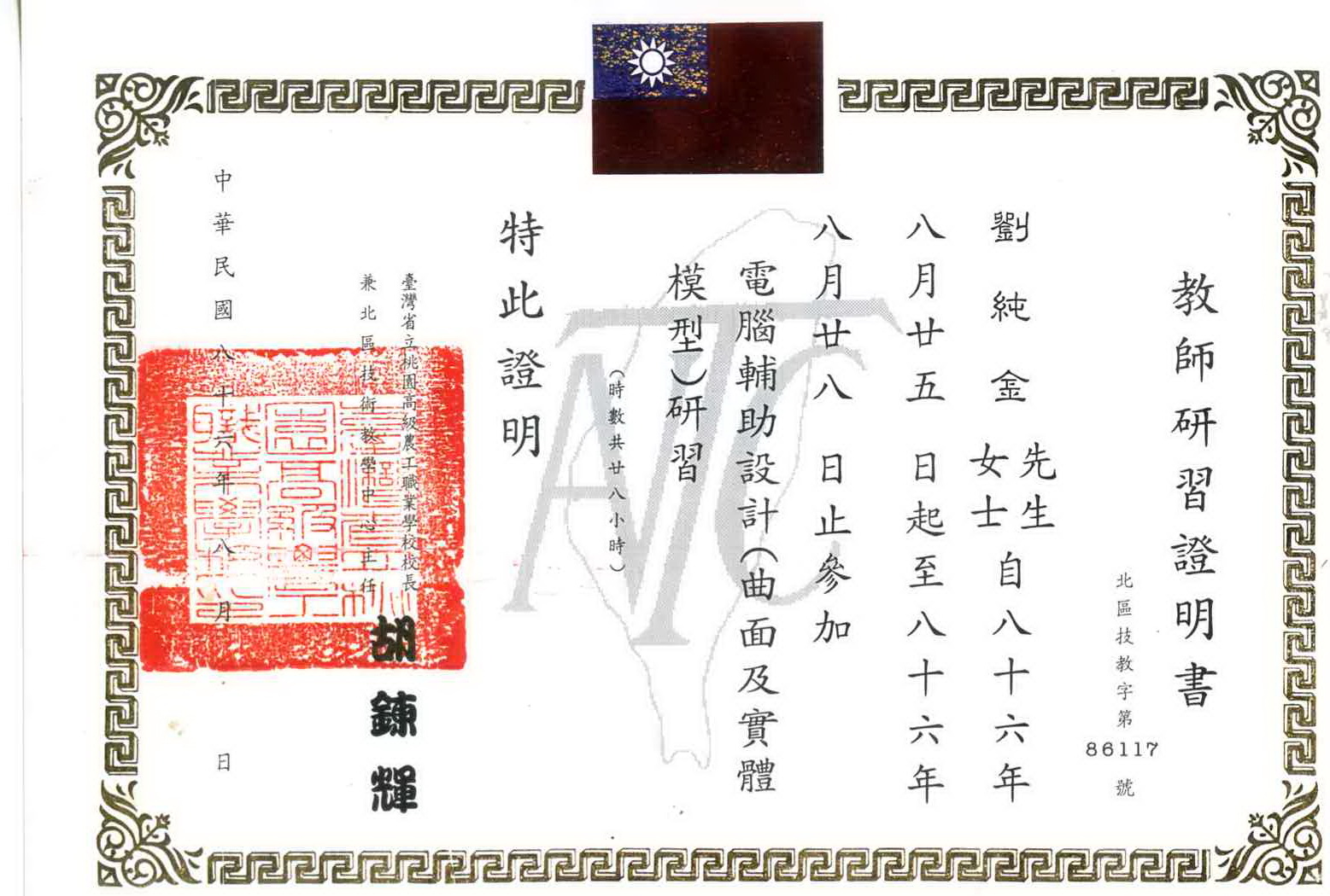 研習經歷 / (三)、休閒研習 / 2、 86年8月 電腦輔助設計(曲面及實體模型) 研習