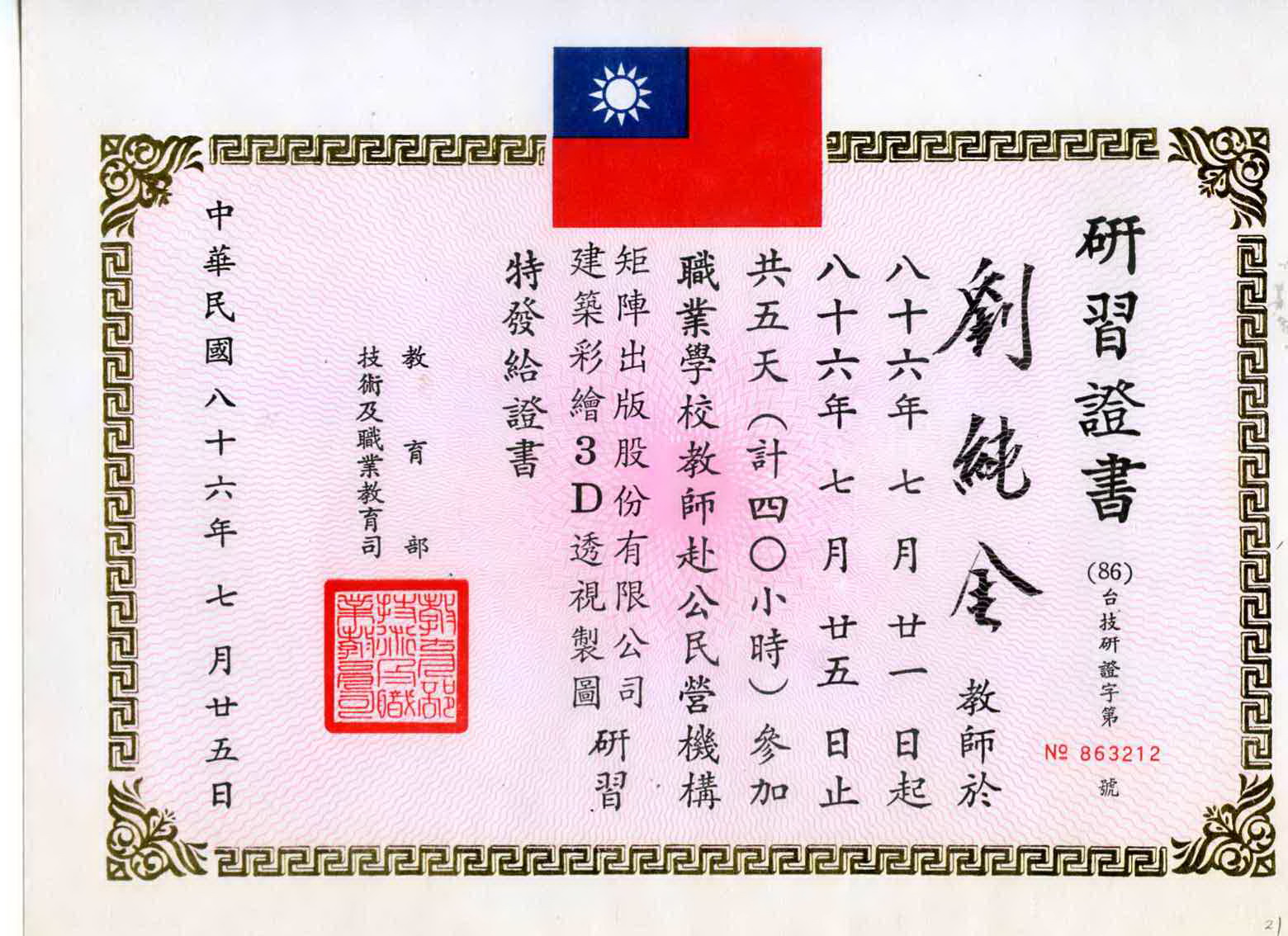 研習經歷 / (三)、休閒研習 / 3、 86年7月 建築彩繪3D透視製圖 研習