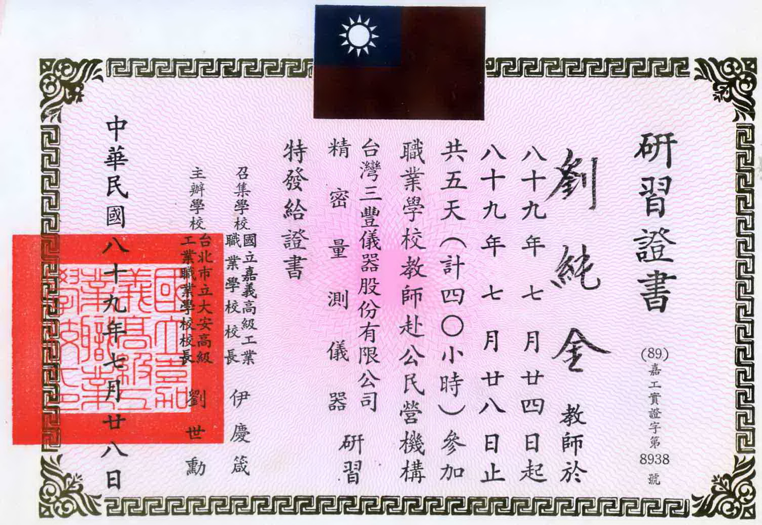 研習經歷 / (三)、休閒研習 / 6、 89年7月 精密量測儀器 研習