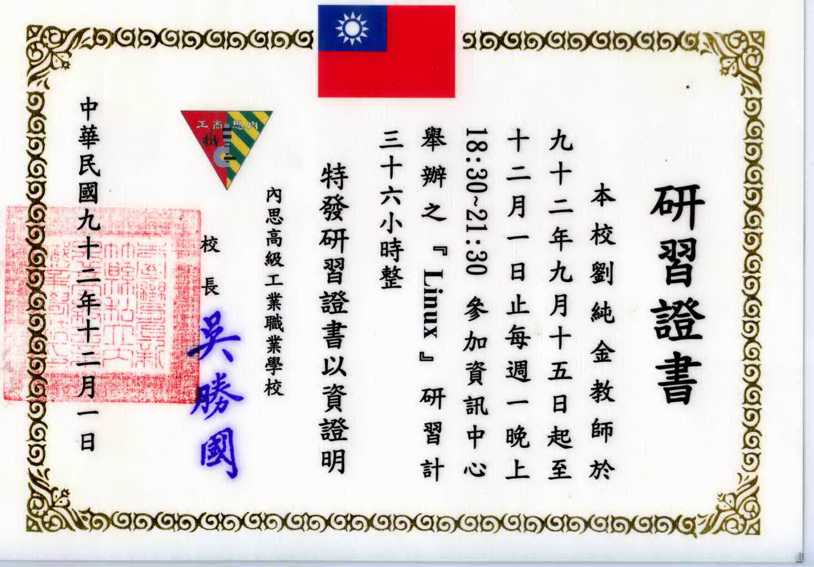 研習經歷 / (三)、休閒研習 / 11、92年12月 內思資訊中心[Linux] 研習
