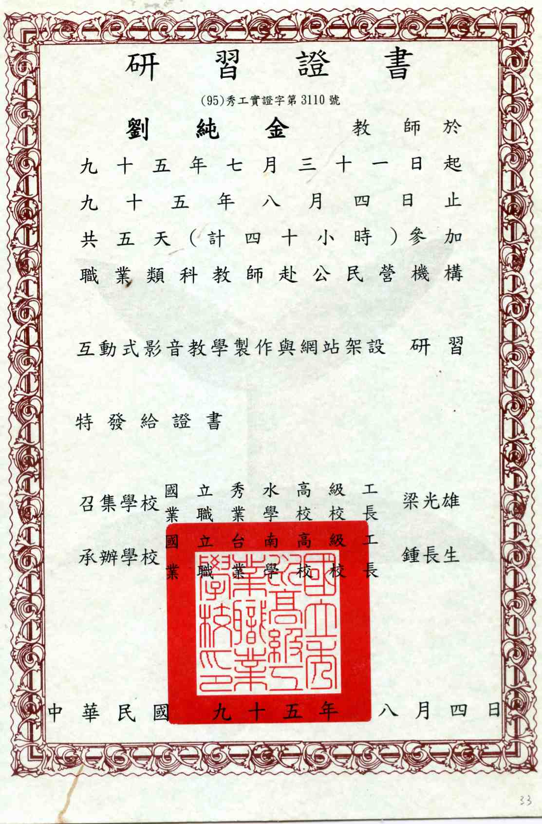 研習經歷 / (三)、休閒研習 / 12、95年8月 互動式影音教學製作與網站架設 研習